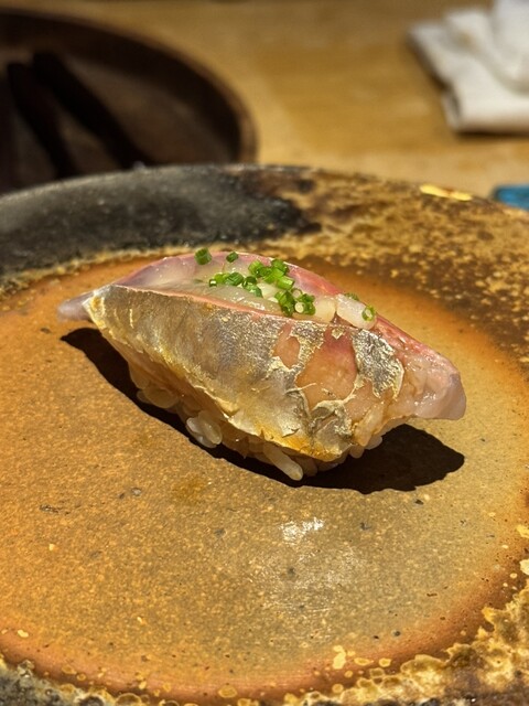 握りは白甘鯛から。脂が程よくのっていてしっとりとしています。シャリは白シャリで、“三心米”と言う独自のお米を使っているようですね。東京と違い酸味はやや抑え気味で優しい甘味。