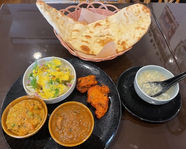注文したのはカレーセット(1,100円)。大きなナン、サラダ、チキンカレーと野菜カレーの2種、タンドリーチキン、そしてラッシーとドリンクも付いていてコスパ最高です。カレーはどちらも具沢山で、ボリューム満点。味もとても美味しく、特にナンはふわふわで香ばしく、カレーとの相性も抜群でした。