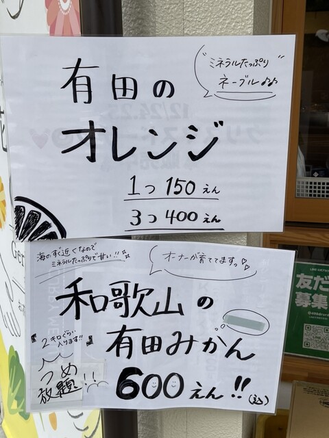 オーナーはみかん農園を営んでおり、新鮮な有田みかんやオレンジを購入できるほか、自家栽培のみかんを使ったみかんジュースも絶品です。