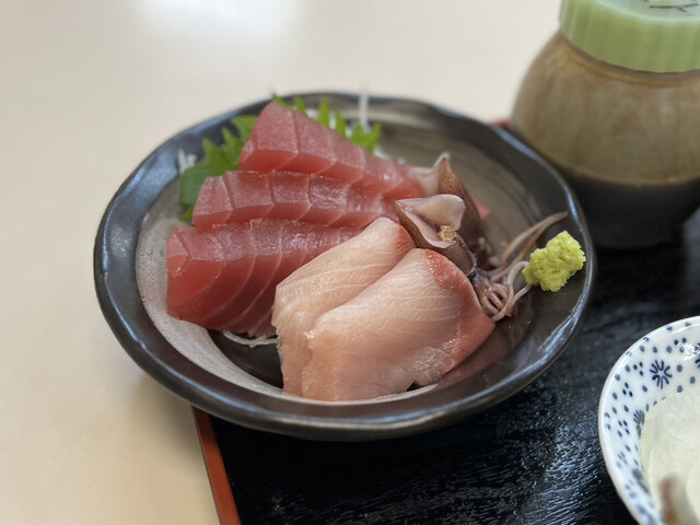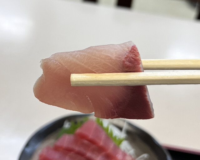 さしみはマグロ三切れブリ二切れ。新鮮でプリプリしている。