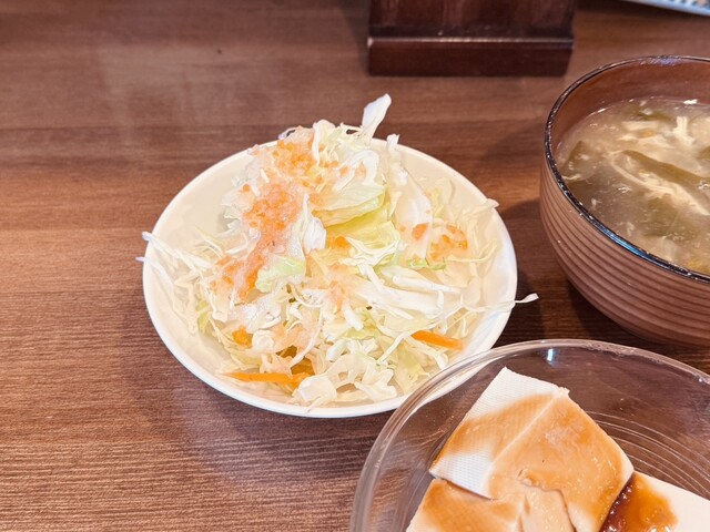 注文した人だけが享受できるこのサラダバー。内容は至ってシンプル。千切りキャベツと人参、木綿豆腐が並ぶ小鉢サラダ。そしてワカメと卵白のとろとろスープ。奇をてらわず、控えめな構成ながら、じんわりと身体に染み渡る。「胃を整える」という概念を形にしたかのような構成で、これだけでも満足感は高い