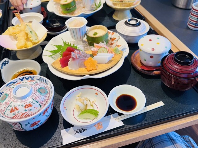 まるで温泉旅館の宴会料理のような豪華さ。膳の上にずらりと並べられた品々に、母も「うわぁ〜」と素直な感嘆の声を漏らす