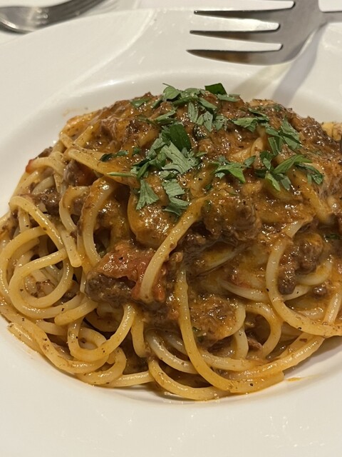 スパークリングワイン、イチジクと生ハムサラダ、フライドポテト、ハラミ肉ロースト、ボロネーゼ全品期待以上。