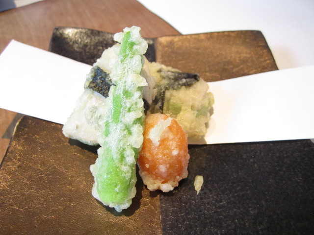 油物(蓮根の磯部揚げ、黄トマトの天ぷら)