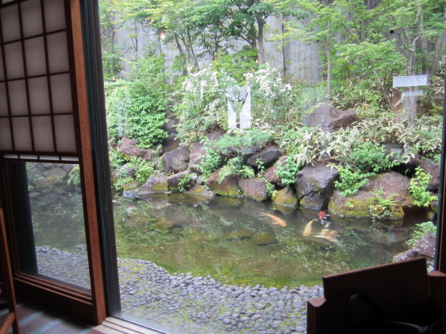 法事関係の団体の他、個室数室からは既に歓談の声が聞こえる。広々とした一般テーブルフロアを希望し、中心部にある中庭を見ながら移動する。この時間は同フロアには先客は無く、好きな席へ座る。高い天井、窓から見える中庭と反対面には池の鯉、落ち着ける空間だ。
