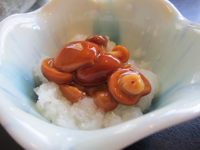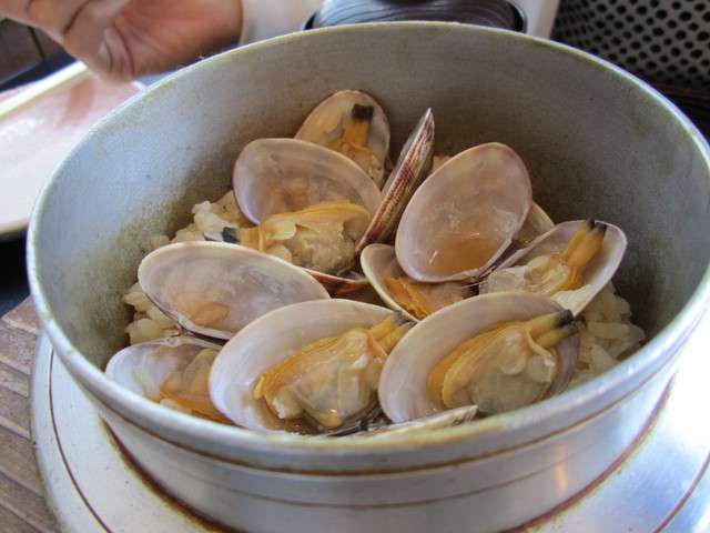 釜めし配膳までの30分、つまみで一杯やるには丁度いい。焼鳥、はまぐり焼、黒ムツ刺身、なめこおろし、漬物。