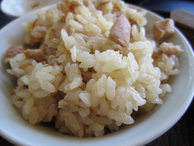 蓋を開けると立ち上がる湯気、米の甘い香りの奥にお焦げの香ばしさが食欲中枢を刺激する。