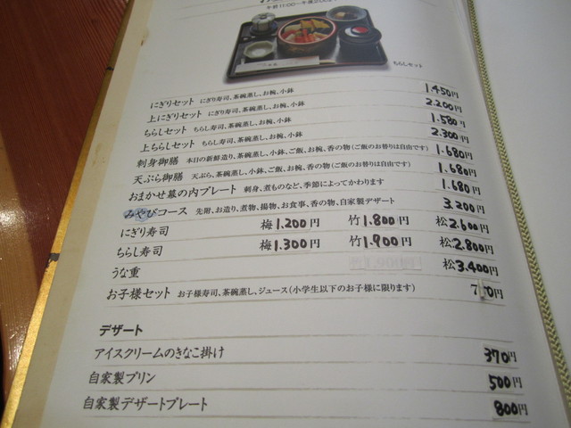 刺身(マグロ)、焼き魚(タレ漬けマグロ)、白身魚ジュレ、温野菜&ジュレ、鶏肉(からすみを添えて)、なます、出し巻き卵、串刺こんにゃく、自家製濃厚豆腐、漬物、海老のみそしる、茶わん蒸し、ご飯
