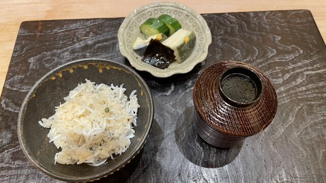 ・しらすと山椒の炊き込みご飯、香の物、赤出汁