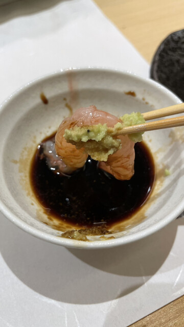 食べてみると分厚く切られて贅沢さが感じられます。そして、どれも新鮮。地物かつ天然に拘っているそうです。甘口醬油も九州ほど甘くなく濃くて旨い。オリジナル醬油も濃口です。わさびはさっぱりした味で、これも秀逸です。