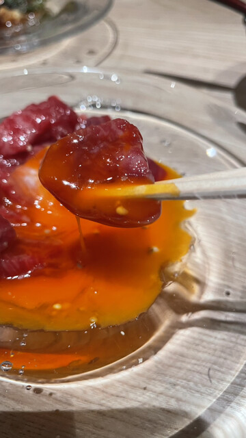・たたきとランプ肉のユッケ〜たたきはニンニクチップと生姜、ねぎ。ユッケはとろーり卵黄と。