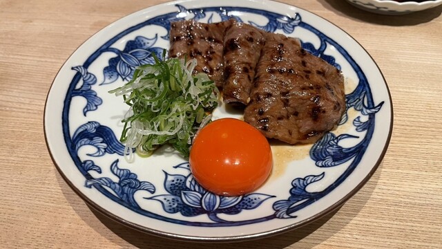 ・サーロイン〜薄切りのサーロインをさっと炙って、すき焼き風に卵黄と。旨いに決まってます。