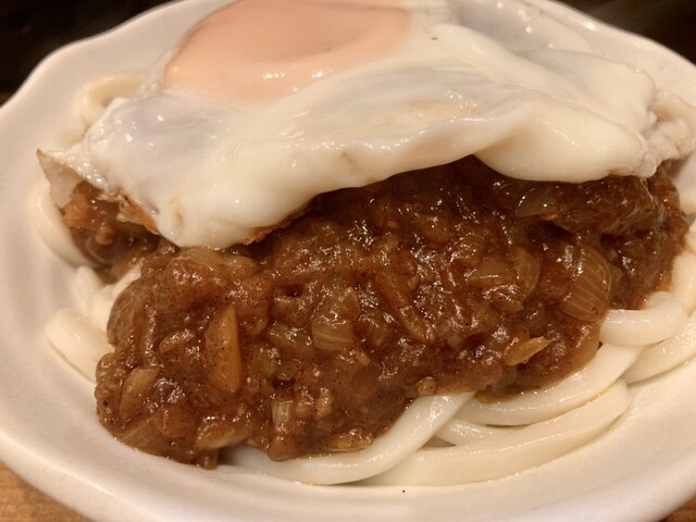 うどん、キーマカレー、目玉焼き、ネギ。