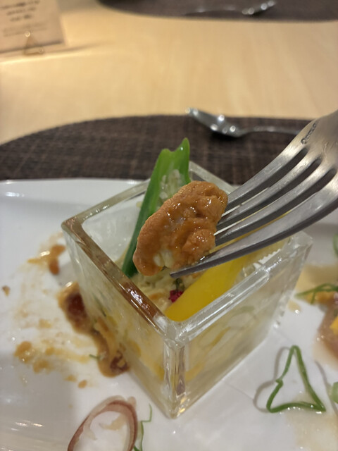 程なくオードブルを提供。今日もフレンチトーストと真鯛の昆布締めは同じですが、今日は冷麺スープ