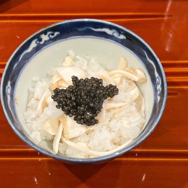 追加キャビアは、塩味が強いですね。でも、松茸ご飯や飛騨牛と合わせるとちょうど良い塩梅になります。