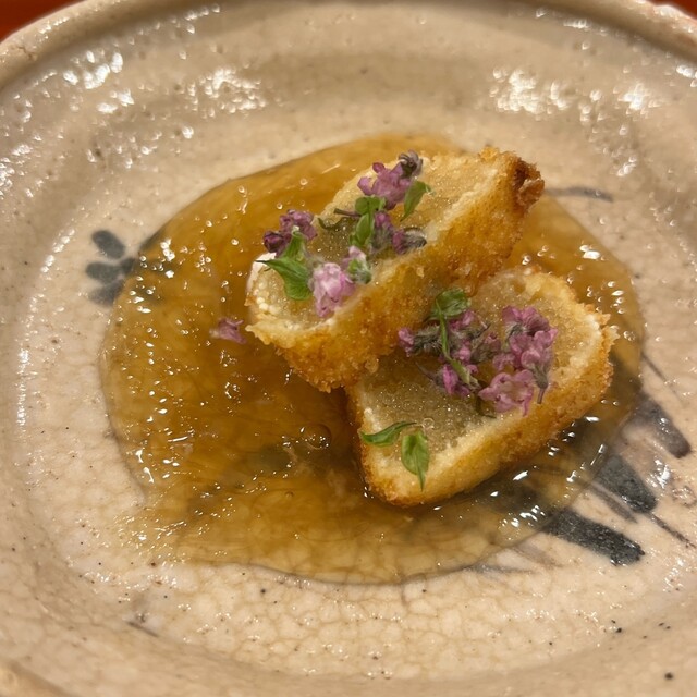 面白いところでは、子持ち昆布のフライにフカヒレソースです。プチプチがたまりません。