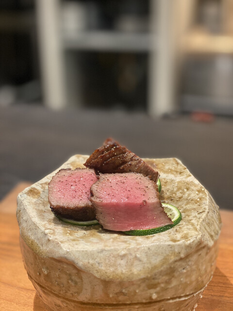 サーロインの下にはいちじくが添えられていて、脂の甘みとフルーツの爽やかさの組み合わせが印象的。コース全体を通して、バランスや演出のセンスが光っていました。サラダや小鉢に至るまで、すべて丁寧に作られていて、最後まで満足度が高かったです。
