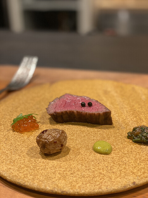 ヘレとサーロインのタルタルには、ウニ・キャビア・鰻まで入っていて、一皿目から贅沢そのもの。素材の旨みが重なって、とても印象に残る一品です。ハチノスをカツに仕上げた料理も絶妙な食感で美味しかった。