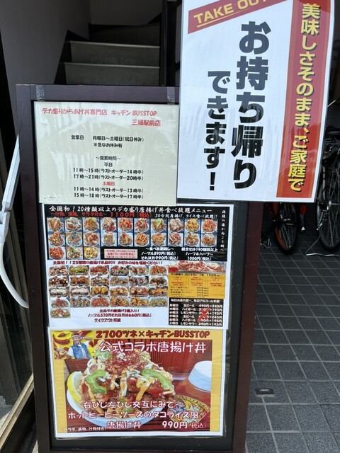 埼玉県三郷市にあるデカ盛り唐揚げ弁当店キッチンBUSSTOPさんの2号店、イートインができる三郷駅前のお店です