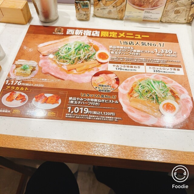 西口店独自のメニューが有るのですが、オーソドックスな標準メニューのピストルを麺大盛り(1.5玉)とレアチャーシュー5枚にしました