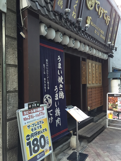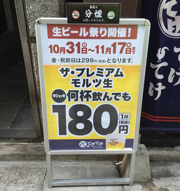 ビール194円:てけてけ日本橋 11/17(月〜木)までプレミアムモルツ180円(税別) (2016/11/09)