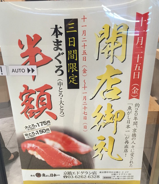 新店500円ランチ:京橋駅ビルにTAVERNA UOKINが11/25オープン (2016/11/10)