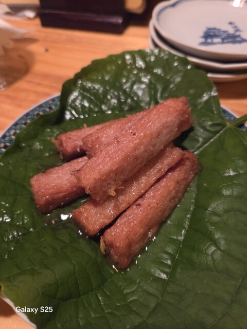 最初は口取り程度の軽い、しかし郷土色溢れる内容の料理が提供され、妻はいきなりその中にある「板わかめ」を大層気に入り「コレ、どこかで販売している物なんですか? そうなら帰りに買って帰りたいんですけど…」と。