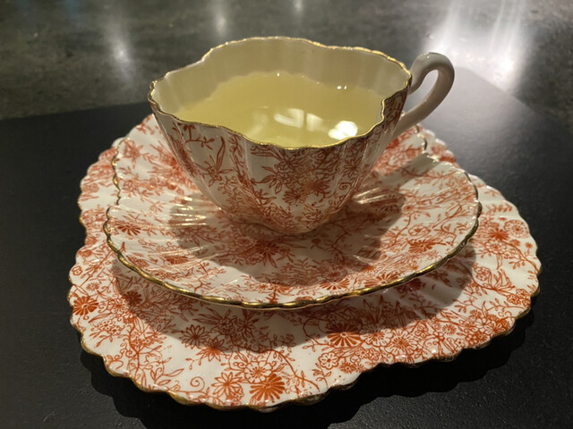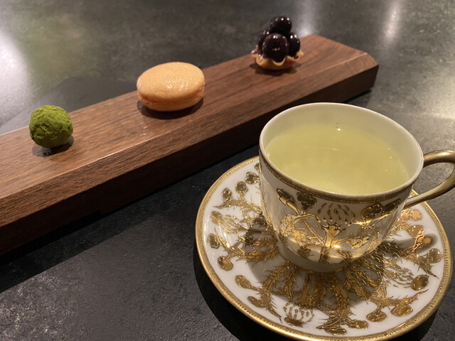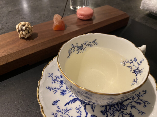 斉藤シェフの説明によると、オールドノリタケで明治時代にヨーロッパに輸出された物で、日本に帰ってきたティーカップとソーサー。