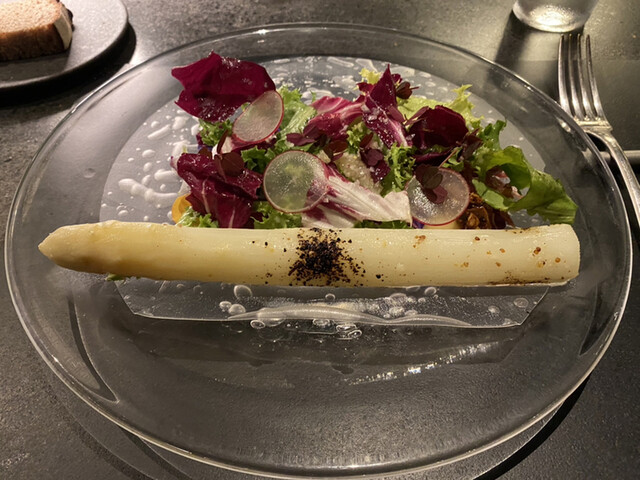 そして食べると大きなグリーンアスパラガスの甘味を軸にレモンのジャム、いくら、サワークリーム、イベリコ豚など入っていて次から次へと味が変化していき、正に完成されたメニュー。