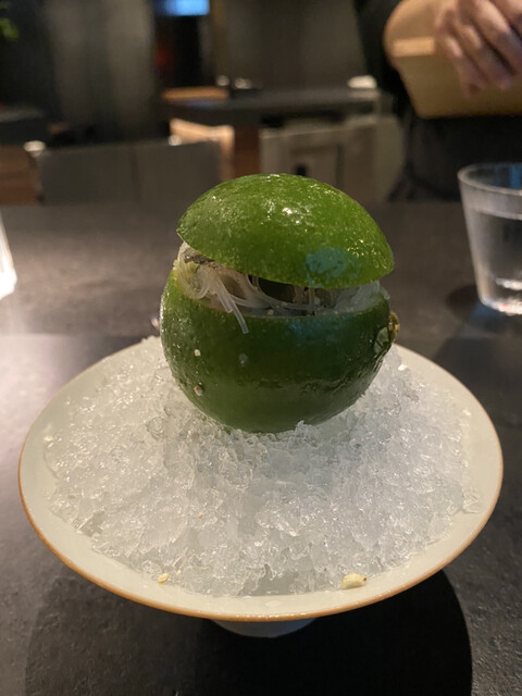 ライムの中にビーフンと鮎の背越しをライムでマリネしたもの。