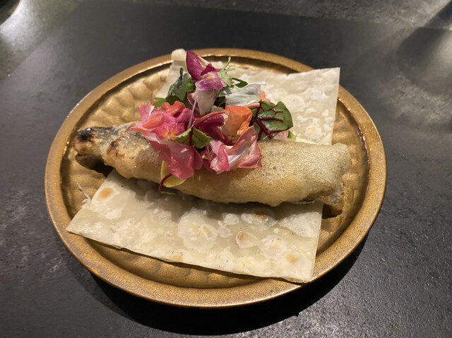 鮎のフリット?と、サラダに激うまソースをタコスで包んで食べる。