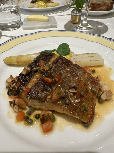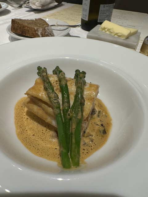 ❸甘鯛の鱗焼き、ロワール産ホワイトアスパラガス、プンタレッラ。