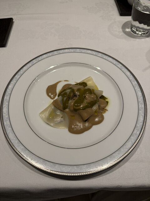 鹿肉のラグーを詰めたラヴィオリ、赤ワインソープ、焦がしバター。