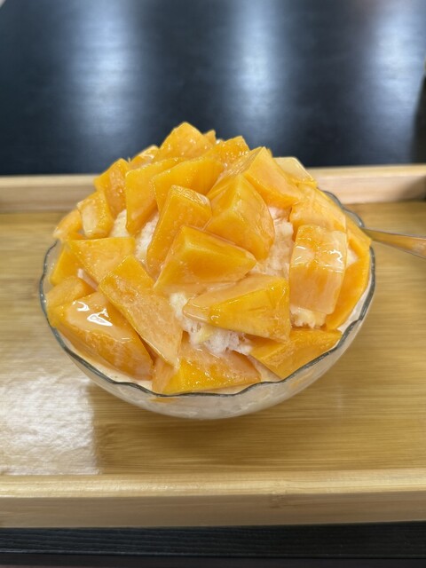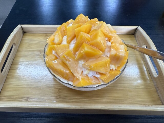 オーダーしてから約10分、運ばれてきたのはマンゴー山盛りのかき氷。ミルクがかかったふわふわのかき氷に、氷が見えないほど敷き詰められたマンゴー。