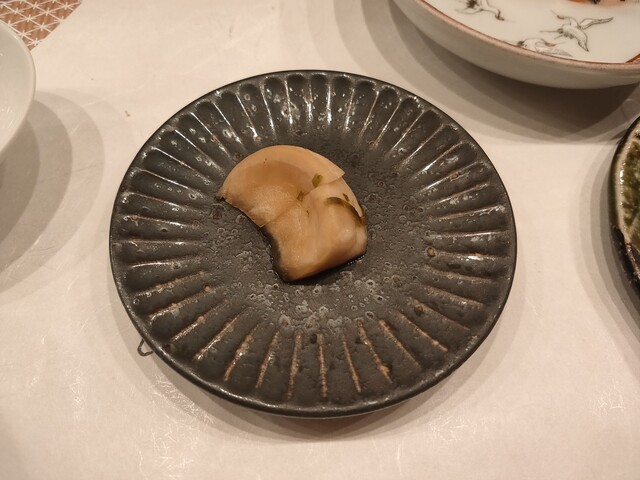 毎回特に楽しみにしているのは、鮟肝と小玉西瓜の奈良漬を合わせた一品です。濃厚な鮟肝のコクに、西瓜に奈良漬のほどよい甘みと塩気が重なっています。一見すると意外な組み合わせですが、それぞれの味がバランスよく繋がり、驚くほどまとまりのある味わいに仕上がっています。噛む程に味の変化があり、この店ならではの工夫と技を強く感じました。