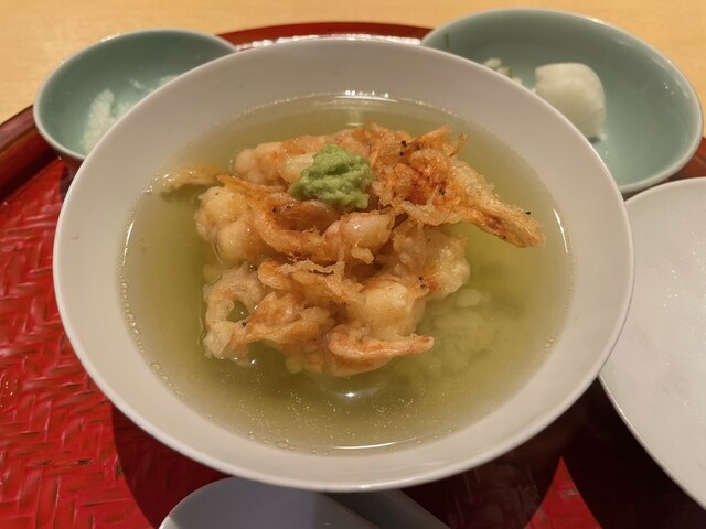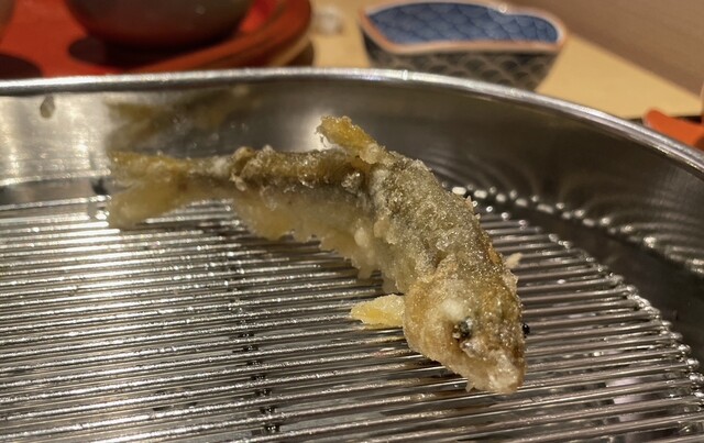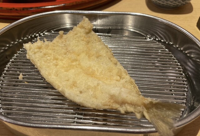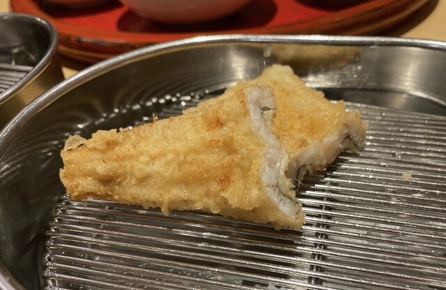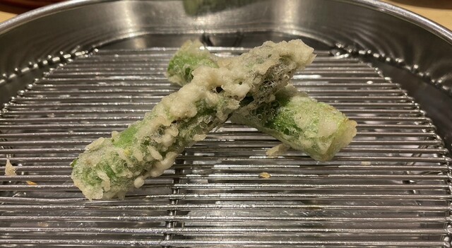 天ぷらは”蒸し料理”と認識しているのですが(違っているかも)、中の食材が、どれも最適と思われる”蒸し加減”(揚げ加減?)で、この衣の薄さでよくぞ!と思ったのが感想です。特に、玉ねぎ、万願寺唐辛子、アスパラなどが秀逸です。