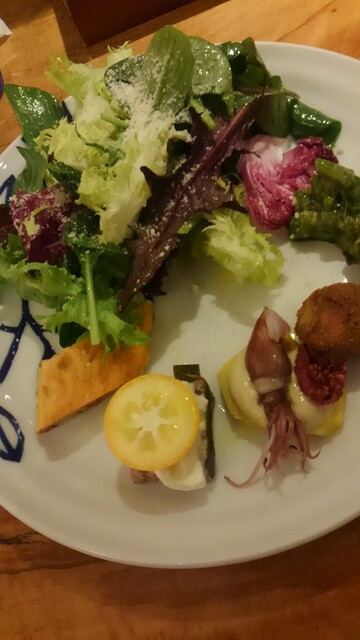 前菜は茄子と蛸のマリネ、オリーブの肉詰めフライ、インカの目覚めホタルイカ乗せ
