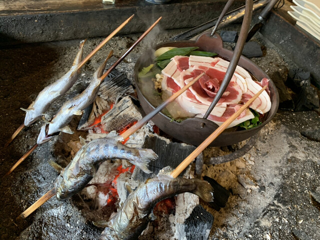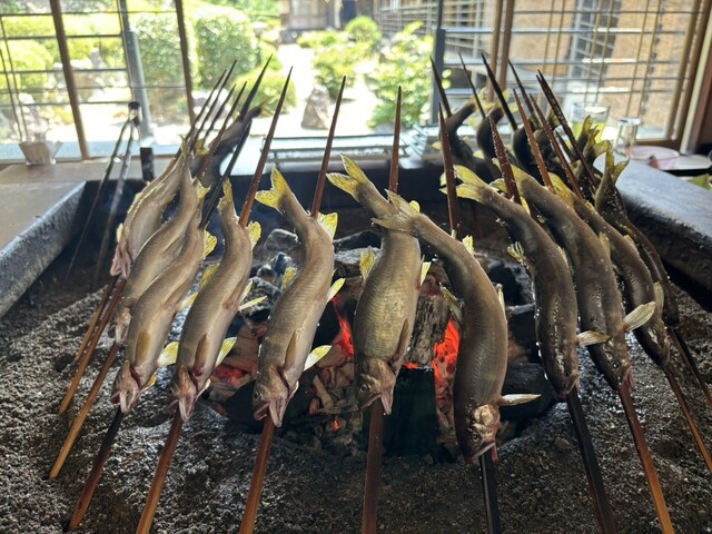 料理はお部屋の中に囲炉裏が有り、鮎をその場で焼いて頂けます。