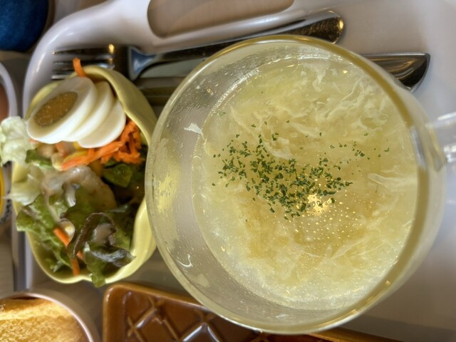 トースト以外にサラダ、スープ、フルーツ、パウンドケーキ、大きなゆで卵までついてます。