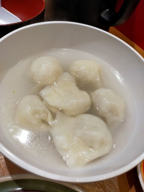水餃子。厚みのある皮がツルン。ムッチリ弾力ある食感がたまらない! 肉汁が溢れる餡は酢多めの醤油と相性抜群。