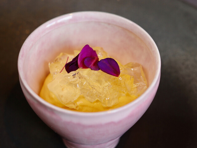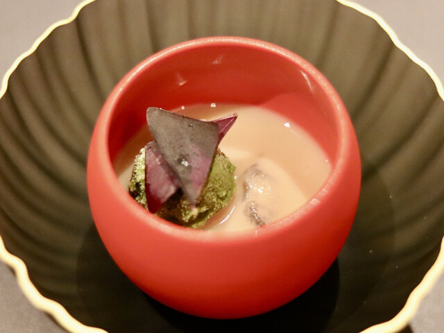 夏野菜のブロードを軍鶏の卵で蒸し上げてフランに。