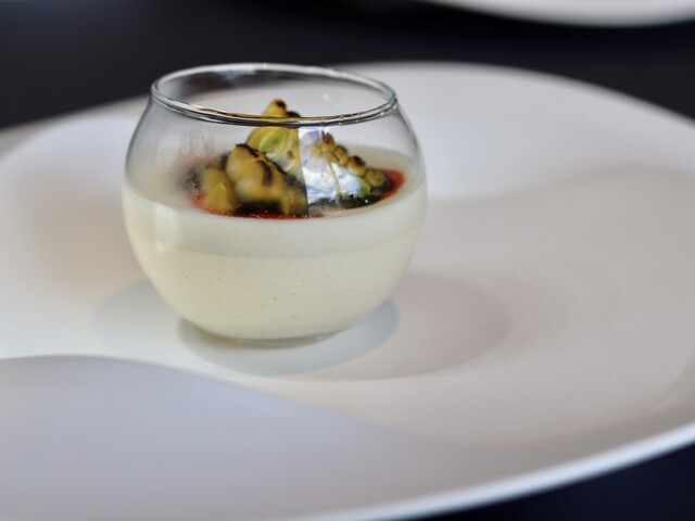フォアグラテリーヌとウワミズザクラの身のソースをかけて。