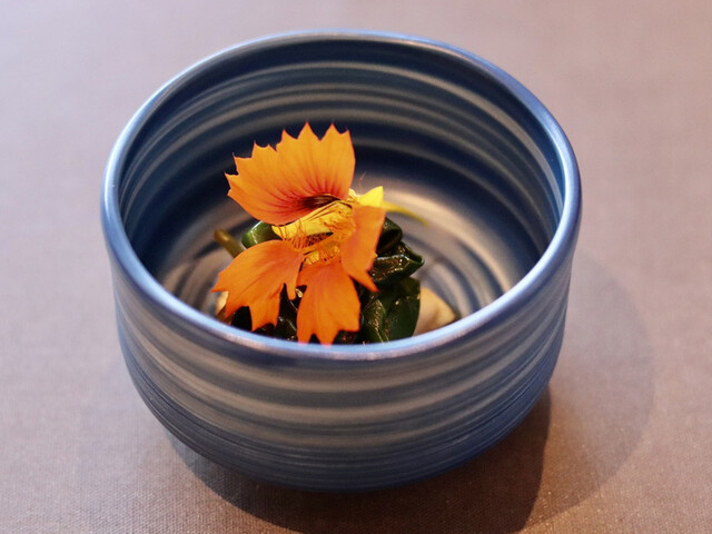 千葉県香取市胡麻油で味付け、ナスタチウムを添えて。