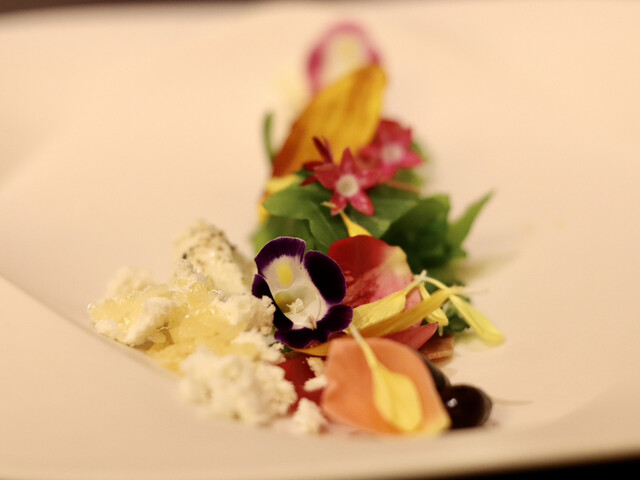 生ハム・自家製エディブルフラワーとハーブのサラダ。