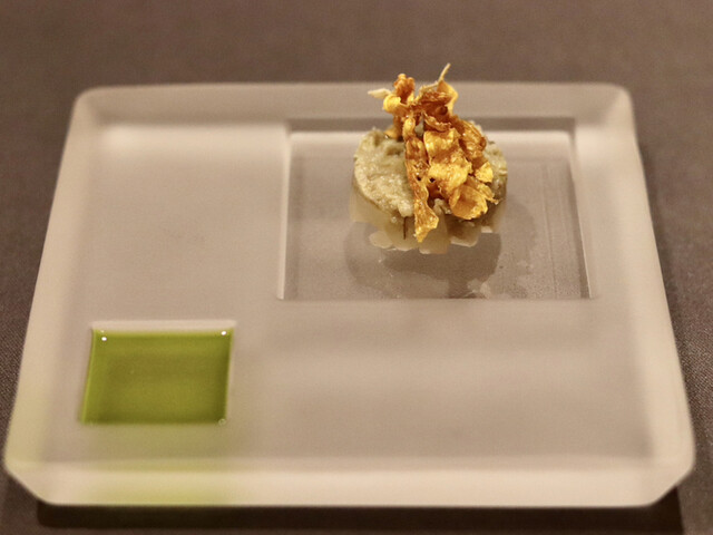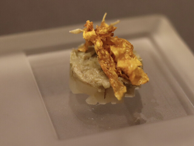 食用向日葵 がくのペーストと花弁の素揚げをのせて。