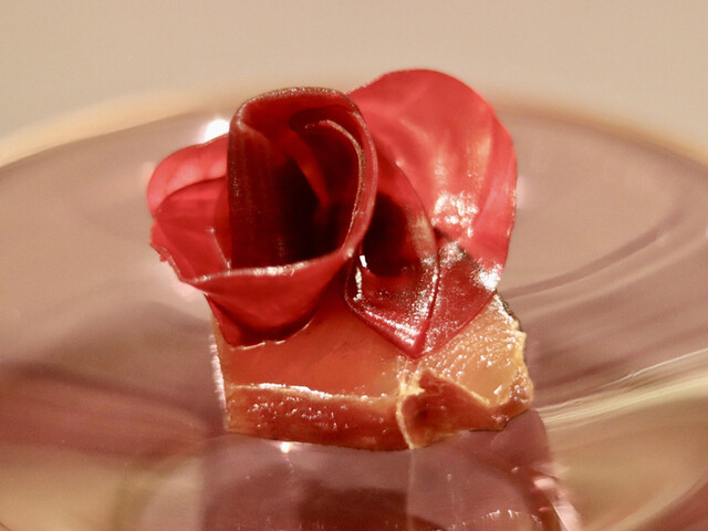 ローズゼラニウムエキスゼリーとブラックオキザリスをのせて。