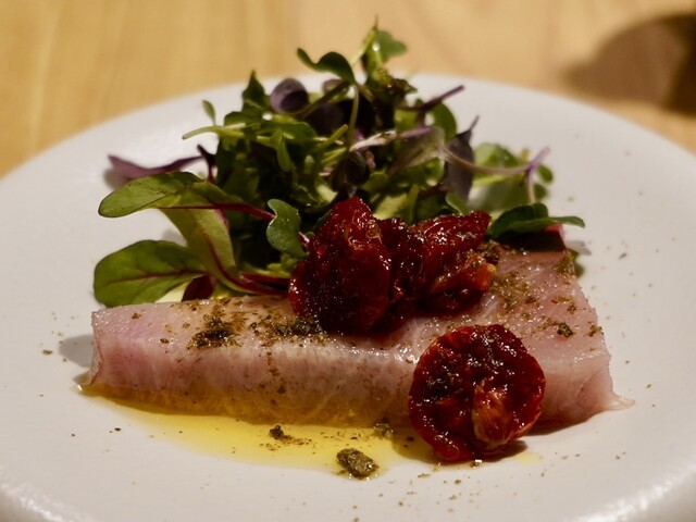 縞鰺はドライトマトと一緒にマリネしており、