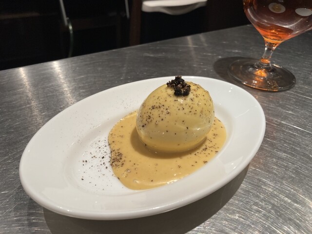 前菜は、いつもの、ウフマヨネーズトリュフ。トリュフの香りとマヨネーズの酸味が半熟卵に絡まり、絶妙に美味しいのです!