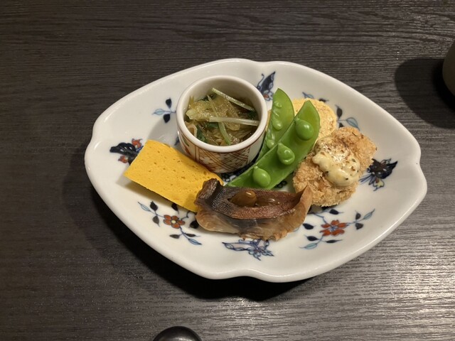 ◯お通し:鯖の燻製、金時人参のカステラ、卵焼き、ブロッコリーの胡麻和え、赤蕪のお漬物、レンコンチップス