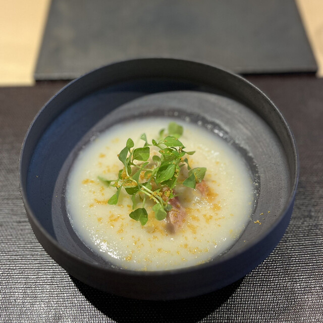 ・発酵させた蕪のすりながし グラッパで戻した自家製カラスミ 山わさび